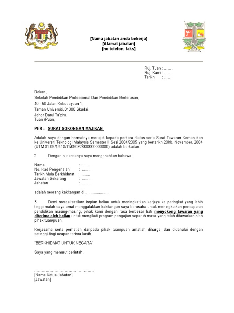 Surat sokongan Kerja Kosong Kerajaan. Simpan Untuk Rujukan Anda. Letter head kepada yang berkenaan tuanpuan sokongan permohonan jawatan saya dengan hormatnya merujuk perkara di atas.